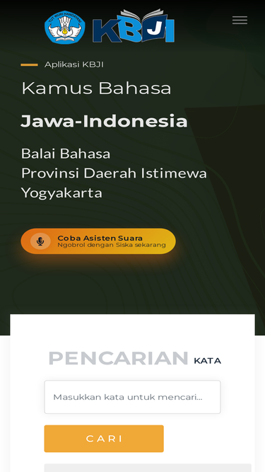 51%KBJI — Kamus Bahasa Jawa–Indonesia gratis dengan ~56.000 lema. Tambahkan usulan lema baru. Dikembangkan oleh Balai Bahasa Daerah Istimewa Yogyakarta.