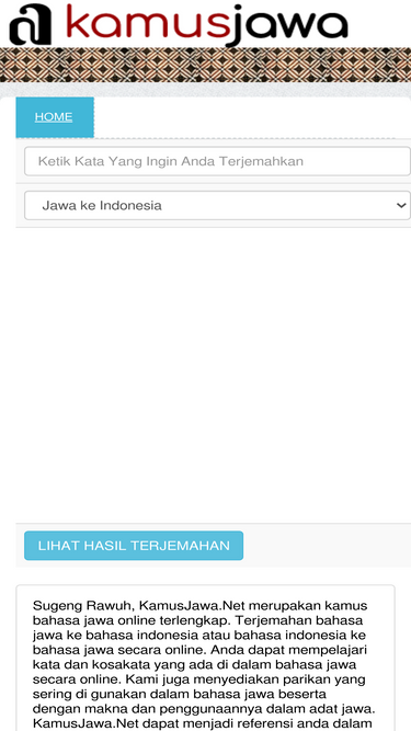 56%KamusJawa.Net merupakan kamus bahasa jawa online terlengkap. Terjemahan bahasa jawa ke bahasa indonesia atau bahasa indonesia ke bahasa jawa secara online