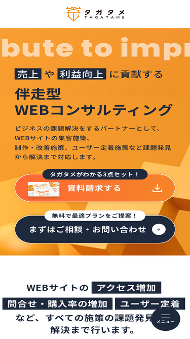 87%1業種1社制の伴走型WEBコンサルティング会社です。ビジネスの課題解決をするパートナーとして、WEBサイトの集客施策、制作・改善施策、ユーザー定着施策など課題発見から解決まで対応します。