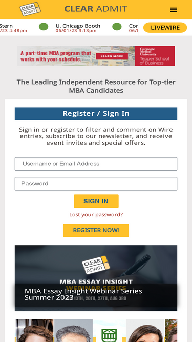 85%Please find answers to Frequently Asked Questions about Clear Admit’s MBA DecisionWire below. If you have additional questions, please contact dw@clearadmit.com. Who should complete MBA DecisionWire? Anyone who has made a final decision regarding which MBA program they will attend is encouraged to share their information. This includes applicants this year, as well as current […]
