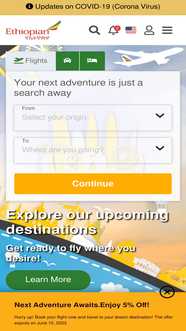 100%Fly to 125+ destinations worldwide with Ethiopian Airlines. Discover our award-winning services, comfortable cabins, and affordable fares. Book now!
