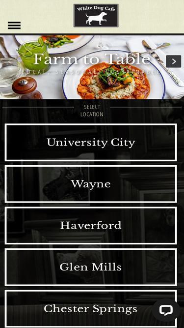 82%when you’re looking for a restaurant, come enjoy the unique american contemporary cuisine of white dog cafe, with four locations in philadelphia, wayne, haverford, glen mills and chester springs (exton), pa. we use only the freshest ingredients from local farms in all dishes. we are open for lunch, dinner & brunch.