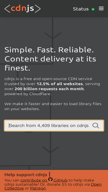 100%The cdnjs API allows for easy programmatic navigation of our libraries. Read the docs to learn about all the endpoints we offer. - Simple. Fast. Reliable. Content delivery at its finest. cdnjs is a free and open-source CDN service trusted by over 12.5% of all websites, serving over 200 billion requests each month, powered by Cloudflare. We make it faster and easier to load library files on your websites.