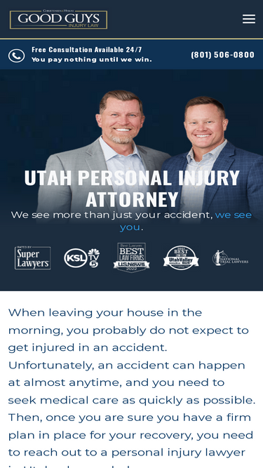 78%Injured in an accident? Call the Utah Personal Injury Attorney at (801) 506-0800. Good Guys Injury Law helps hundreds of Utah residents.