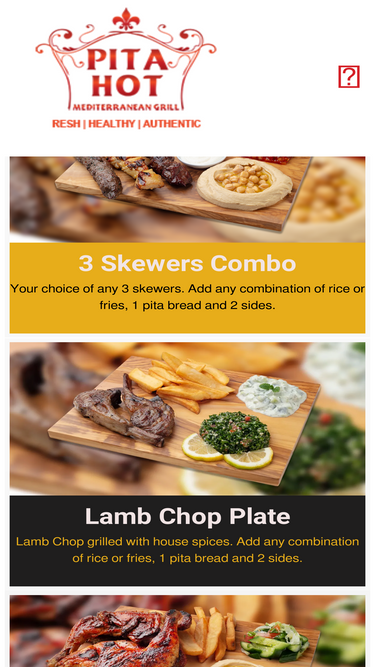 98%welcome to Pita Hot Order Online Popular Orders 3 Skewers Combo Your choice of any 3 skewers. Add any combination of rice or fries, 1 pita bread and 2 sides. Lamb Chop Plate Lamb Chop grilled with house spices. Add any combination of rice or fries, 1 pita bread and 2 sides. Grilled Bone In