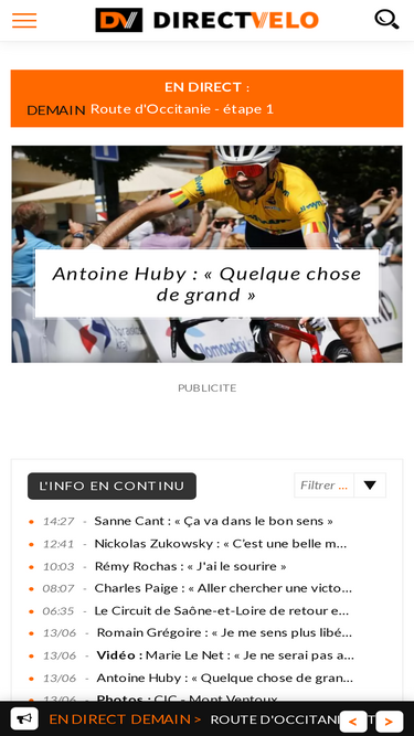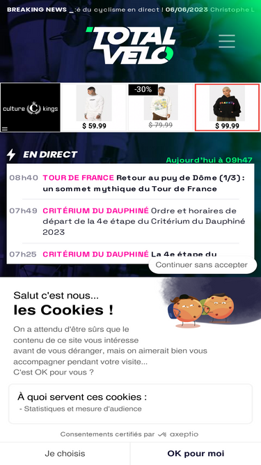 77%Toute l'actualité cyclisme et les classements, statistiques, vidéos en direct du Tour de France, Giro, Paris-Roubaix sont sur TotalVelo.