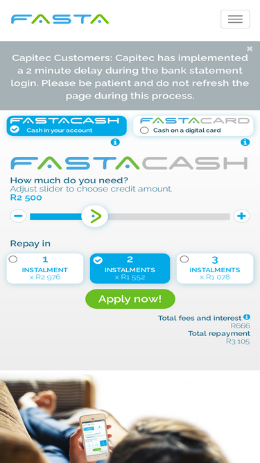 67%short-term loans from r800 to r8000. apply today, get funded in minutes. online, easy and fast. cash into your bank account or on a virtual card.