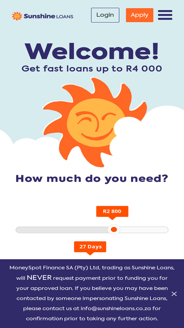 83%Sunshine Loans is committed to providing you with a hassle-free solution to your short term borrowing needs. Get Fast Loans from $200 - R4 000