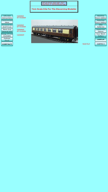 87%easy-build specialise in producing models and kits of british outline railway equipment and components. br mk1 carriages are our main product line producing all the standard passenger carrying vehicles in the series both mainline and suburban. kits are moulded in plastics with cast and etched metal detailing parts. components such as coach wheelsets, bogies, interior details, window glazing and exterior details are also available. ready to run custom-built coaches and locomotives are produced as special orders to customers requirements from any make of kit.