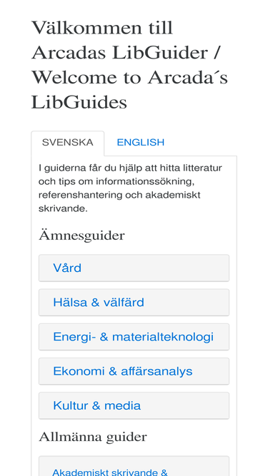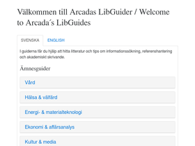85%Välkommen till Arcadas LibGuider / Welcome to Arcada´s LibGuides I guiderna får du hjälp att hitta litteratur och tips om informationssökning, referenshantering och akademiskt skrivande / The guides help you discover relevant litterature and research, write your own research and keep up to date with your field.