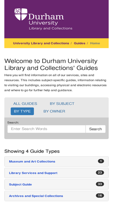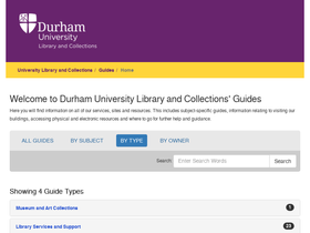 92%Welcome to Durham University Library and Collections' Guides Here you will find information on all of our services, sites and resources. This includes subject-specific guides, information relating to visiting our buildings, accessing physical and electronic resources and where to go for further help and guidance.