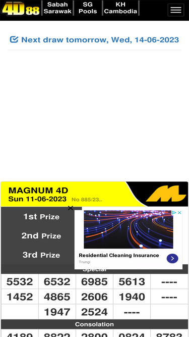 95%Check 4D results live. Magnum, 4D Toto, Damacai 4D result, Sabah 88 Lotto 4D, Sarawak Special Cash Sweep 4D, STC 4D, Singapore Pools 4D. Keputusan Hari Ini 4D in Sabah, Sarawak, Malaysia.