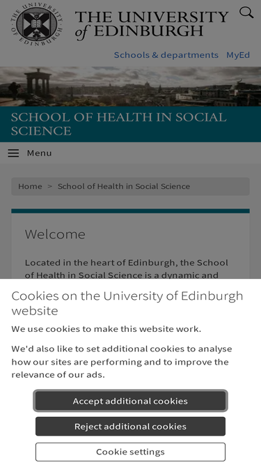 83%Located in the heart of Edinburgh, the School of Health in Social Science is a dynamic and inclusive environment for learning, teaching and research. Our interdisciplinary approach to our subject areas equips students with the knowledge and skills to tackle the most pressing health and social challenges, from individual mental health to global pandemics.