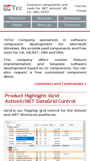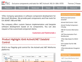 84%10Tec product line includes exclusive components and tools for the ActiveX/.NET platforms. 10Tec iGrid is the flagship ActiveX grid and WinForms grid control, DataGridView alternative and editable ListView/MSFlexGrid replacement for VB6, VBA, VB.NET and C#.