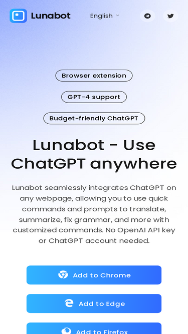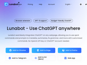 82%the lunabot.ai is your great ai assistant for all browsers and telegram, helping you anytime anywhere in reading, writing for study, and work. no chatgpt account is required, and no openai key is required.