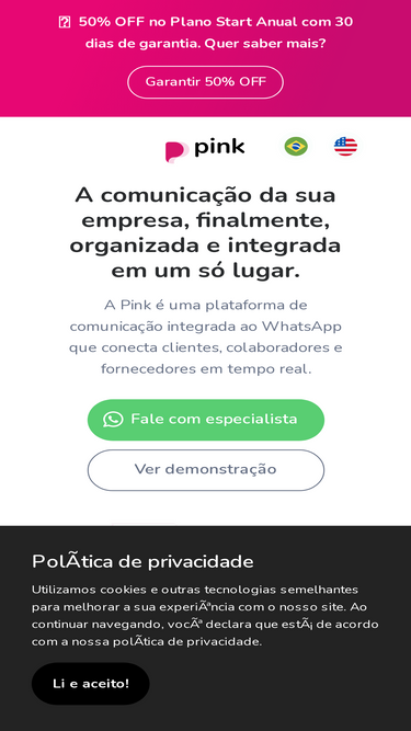 50%A Pink é uma plataforma de comunicação integrada ao WhatsApp que conecta clientes, colaboradores e fornecedores em tempo real.