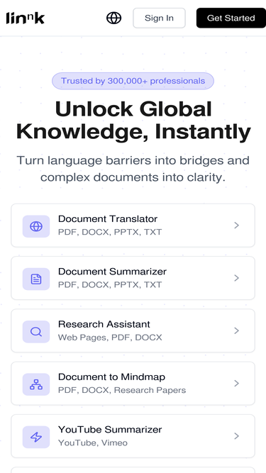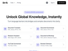 93%Permudah riset & alur kerja Anda dengan ringkasan & penerjemah AI Linnk.ai. Proses dokumen & konten web secara instan. Sempurna untuk pelajar, akademisi & profesional.