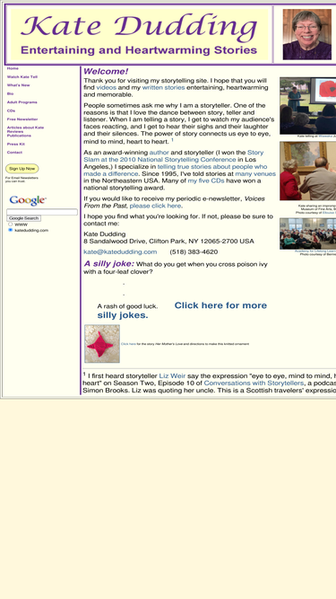 100%kate dudding is a storyteller in the albany/saratoga springs area of new york state, usa. she creates entertaining, heart-warming and memorable stories, including stories about people who made a difference, for groups of all ages.