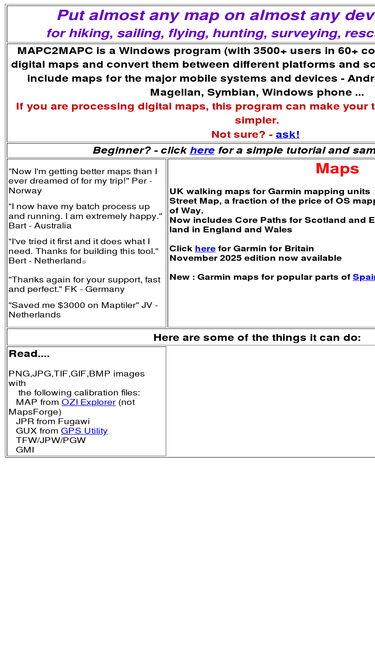 mapc2mapc is a windows program to manipulate digital maps and convert them between different platforms and software. output formats include maps for the major mobile systems and devices - android, iphone, garmin, magellan, symbian, windows phone. also functions to crop, rescale and reproject digital maps retaining calibration