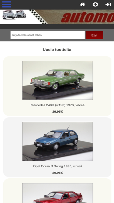 100%automodels : - fiat alfa romeo ford peugeot mercedes opel audi bmw citroen porsche ferrari lancia ralliautot nissan / datsun renault vw saab volvo simca mitsubishi muut automerkit traktorit ja työkoneet kaksipyöräiset hyötyajoneuvot toyota mini ennakkoon tilattavat... muut tuotteet rata kilpa-autot skoda b-laatu / vialliset lelut seat subaru lamborghini lada chevrolet dodge jaguar wartburg perävaunut pienoismallien verkkokauppa