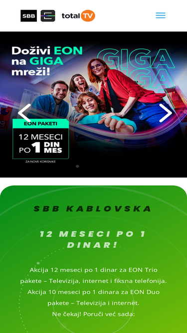 84%SBB EON Paketi - Akcija 4 meseci po 1 dinar: popusti na EON Trio Pakete! Uz SBB EON uživajte u najnovijim filmovima i serijama po top cenama.