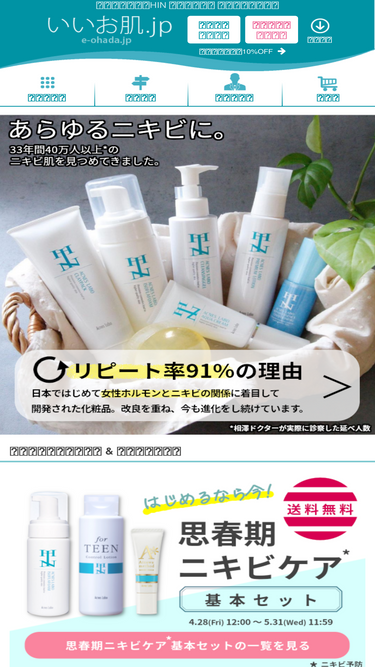 87%ニキビ治療で有名な皮膚科専門医のドクター相澤が開発した化粧品のサイトです。ニキビは殺菌だけではキレイにならない!根本的改善を考えて作りだした化粧品の通販サイトです。大人ニキビの対策はhinアクネスラボ化粧品「いいお肌.jp」で。