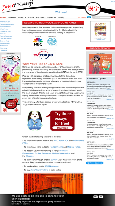 92%FAQ about Joy o' Kanji: current and coming features, the Joy o' Kanji approach, reasons to learn kanji, prices, and what you'll need to know first.