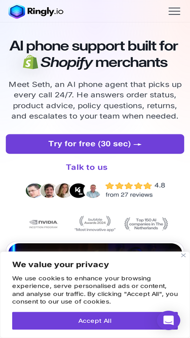 Ringly’s AI phone agent handles 70% of ecommerce support calls. It checks orders, answers questions, recommends products, and transfers complex issues