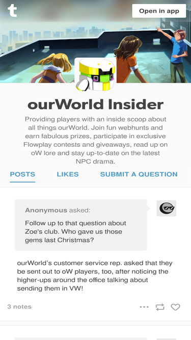 99%Providing players with an inside scoop about all things ourWorld. Join fun webhunts and earn fabulous prizes, participate in exclusive Flowplay contests and giveaways, read up on oW lore and stay up-to-date on the latest NPC drama.