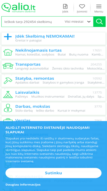 skelbimų portalas: baldai, kompiuteriai, telefonai, buitinė technika, foto, video, gyvūnai, knygos, turizmas, drabužiai, vežimėliai, statyba, nuoma, paslaugos, dviračiai, automobiliai.