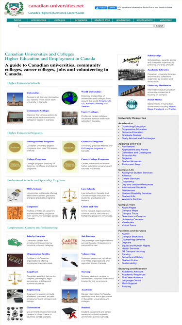 83%a guide to canadian universities, community colleges and career colleges. includes profiles of universities and colleges in canada along with their available certificate, undergraduate and graduate programs. the site also provides information for getting into university and resources for current and students who have graduated. employment and career resources for students, graduates and those seeking a career change.