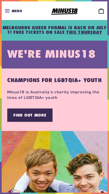 100%Minus18 aims to improve the health and wellbeing of, and provide a safe environment for, same-sex attracted and gender diverse young people in Australia, seeking to empower them to feel comfortable and confident in their sense of identity and assisting them to grow as happy, healthy individuals well into the future.