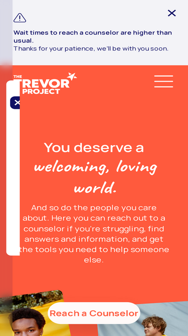 100%Support the mental health of LGBTQ young people by volunteering with The Trevor Project. Learn more about training, requirements, and how to apply.