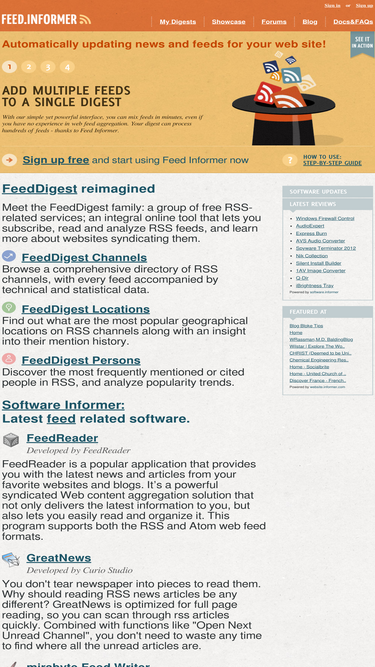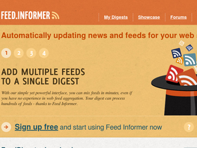 99%feed informer lets you aggregate, parse, mix and syndicate rss and atom feeds. it also provides tools to convert feeds to web widgets ready to be published on almost any web page.