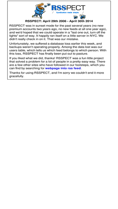 100%rsspect allows everyone to create their own free rss feeds - either by hand, or automatically, with content taken automatically from their existing website.