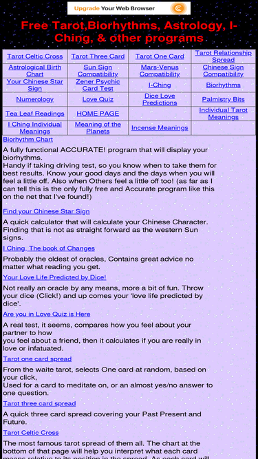 99%the first and most popular divination site, offering free tarot, rune, i ching, biorhythm, and numerology readings since 1993!