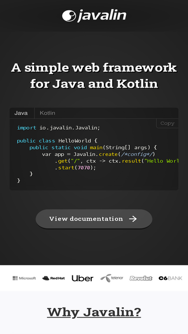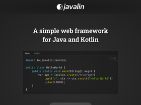 74%Javalin - A lightweight Java and Kotlin web framework. Create REST APIs in Java or Kotlin easily.