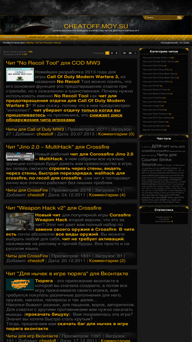 83%здравствуйте уважаемые пользователи сайта cheatoff.moy.su во-первых мы рады видеть вас на нашем читерском сайте.на нашем чит-сайте по игре counter-strike 1.6, вы можете скачать читы.читы бывают разными, wallhack,aim,speedhack и другие.кроме читов есть различные хаки для cs-1.6, которые добавляют некоторое преимущество над другими игроками.также вы можете скачать специальную версию counter-strike 1.6