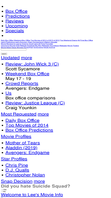 81%lee's movie info offers daily box office reports, weekend analysis, predictions, movie reviews and info, movie games.