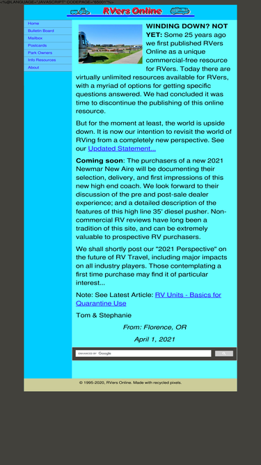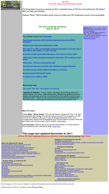 84%indexed links to over 800 sites of interest to rvers. rv advice for beginners, motorhome and 5th wheel travel trailer manufacturers, rv accessories, rv clubs, rv campgrounds, rv advice books.
