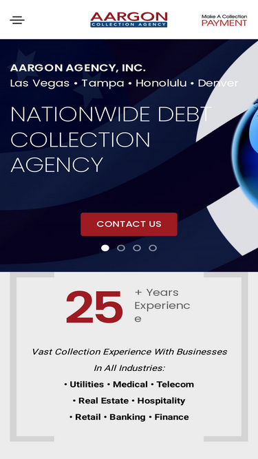 100%aargon collection agency is a nationally licensed debt collection agency headquartered in las vegas, nevada with three offices in hawaii, florida and . aargon offers comprehensive debt collection agency services nationwide for utility company, medical, healthcare, real estate, entertainment, retail, banking and finance industries. our strengths are based on resourceful and aggressive debt collection practices that are continuously developed using the latest technology. aargon collection agency also offer early-out pre-collection services, billing services and mailing services for heathcare providers.