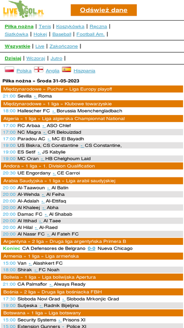 100%globalne wyniki na żywo ze wszystkich aren sportowych. najszybsze wyniki sportowe online. informacje stadionowe, relacje sekunda po sekundzie na żywo.