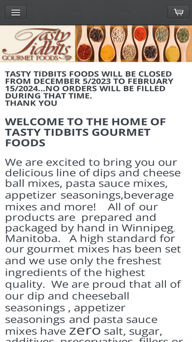 98%WELCOME TO THE HOME OF TASTY TIDBITS GOURMET FOODS We are excited to bring you our delicious line of dips and cheese ball mixes, pasta sauce mixes, appetizer seasonings,beverage mixes and more! ...