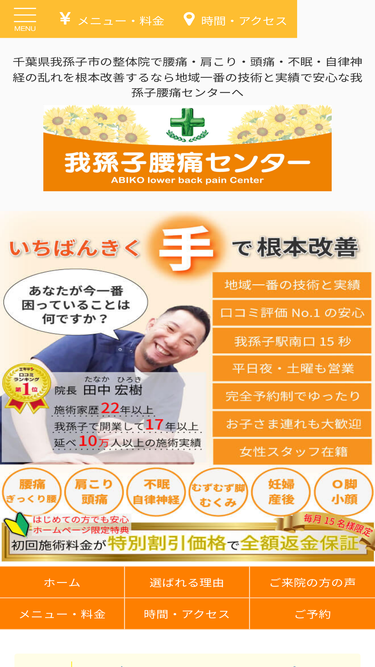 84%千葉県我孫子市の整体院で腰痛・肩こり・頭痛・不眠・自律神経の乱れを根本改善するなら、口コミ評価no.1、地域一番の技術と実績で安心な我孫子腰痛センターがおすすめです。南口駅前15秒、平日夜・土曜も営業、完全予約制で便利にご利用いただけます。