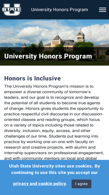 55%utah state university honors program home page links to current and prospective student information as well as applications and resources for faculty and alumni