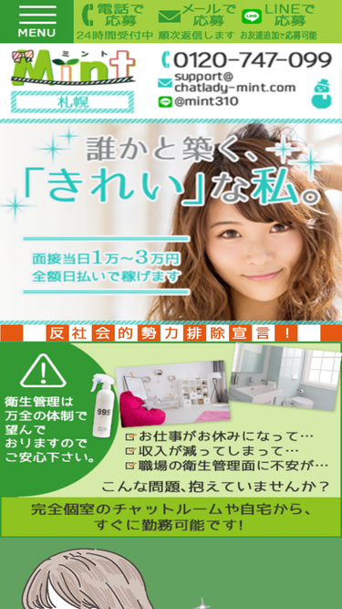 89%札幌でチャットレディ求人をお探しなら、即日現金払いが嬉しい!チャットレディ・プロダクション「ミント札幌」!面接交通費5,000円支給中♪札幌駅店は16番出口から徒歩1分、新規オープンの大通店は大通り11番出口から徒歩5分!終電後はスタッフが送迎、チャットレディ経験のある女性スタッフがいるので安心!