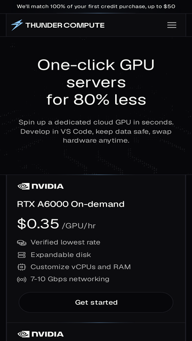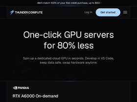 96%One-click GPU instances — Thunder Compute® official—spin up A100s in VS Code and save 80% vs AWS, no contracts. Launch GPU instances in seconds on Thunder Compute®—pay-as-you-go A100s from $0.66/hr. Tesla T4 for $0.27/hr.
