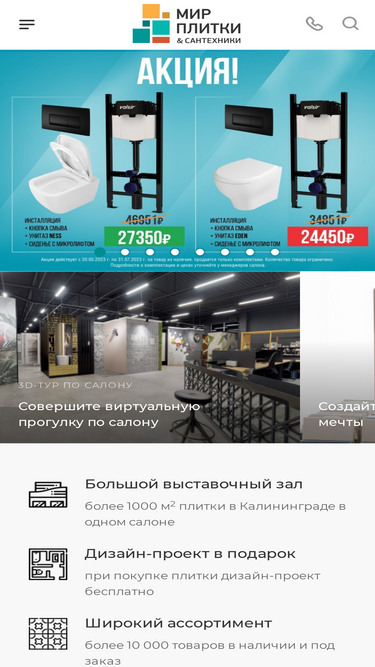 90%Более 1000м² напольных покрытий, сантехники, мебели и аксессуаров для ванных комнат в салоне «Мир плитки и сантехники» в Калининграде на Б. Окружной, 5.