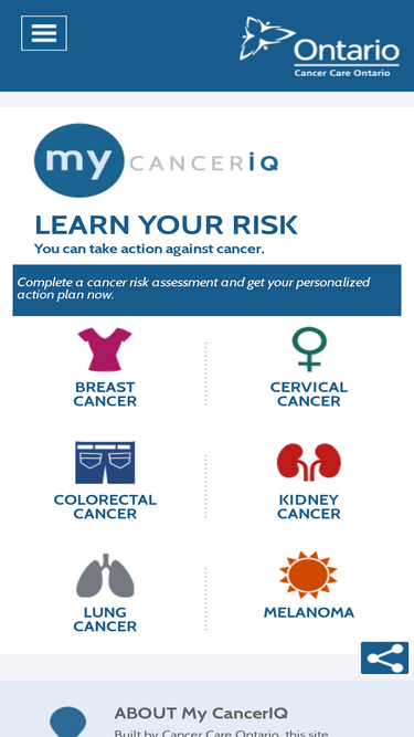92%Do you know the risk factors for kidney cancer and what you can do to reduce your risk? Find out with My CancerIQ, a quick, science-based assessment brought to you by Cancer Care Ontario: https://mycanceriq.ca/Cancers/Kidney