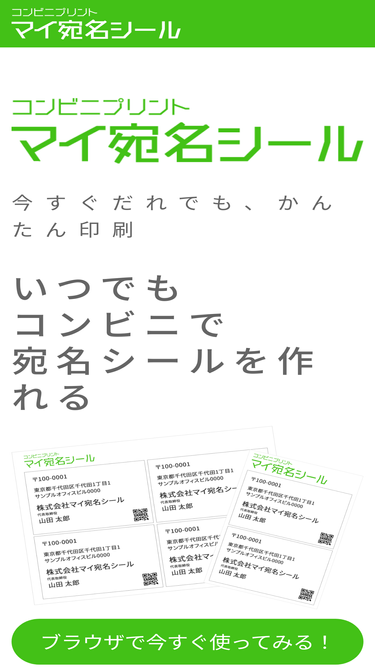 96%マイ宛名シールで宛名や差出人シールをスマホでかんたん作成! コンビニで24時間365日いつでも印刷♪ オークションやフリマの送りものや企業の送付物などに活用できます!
